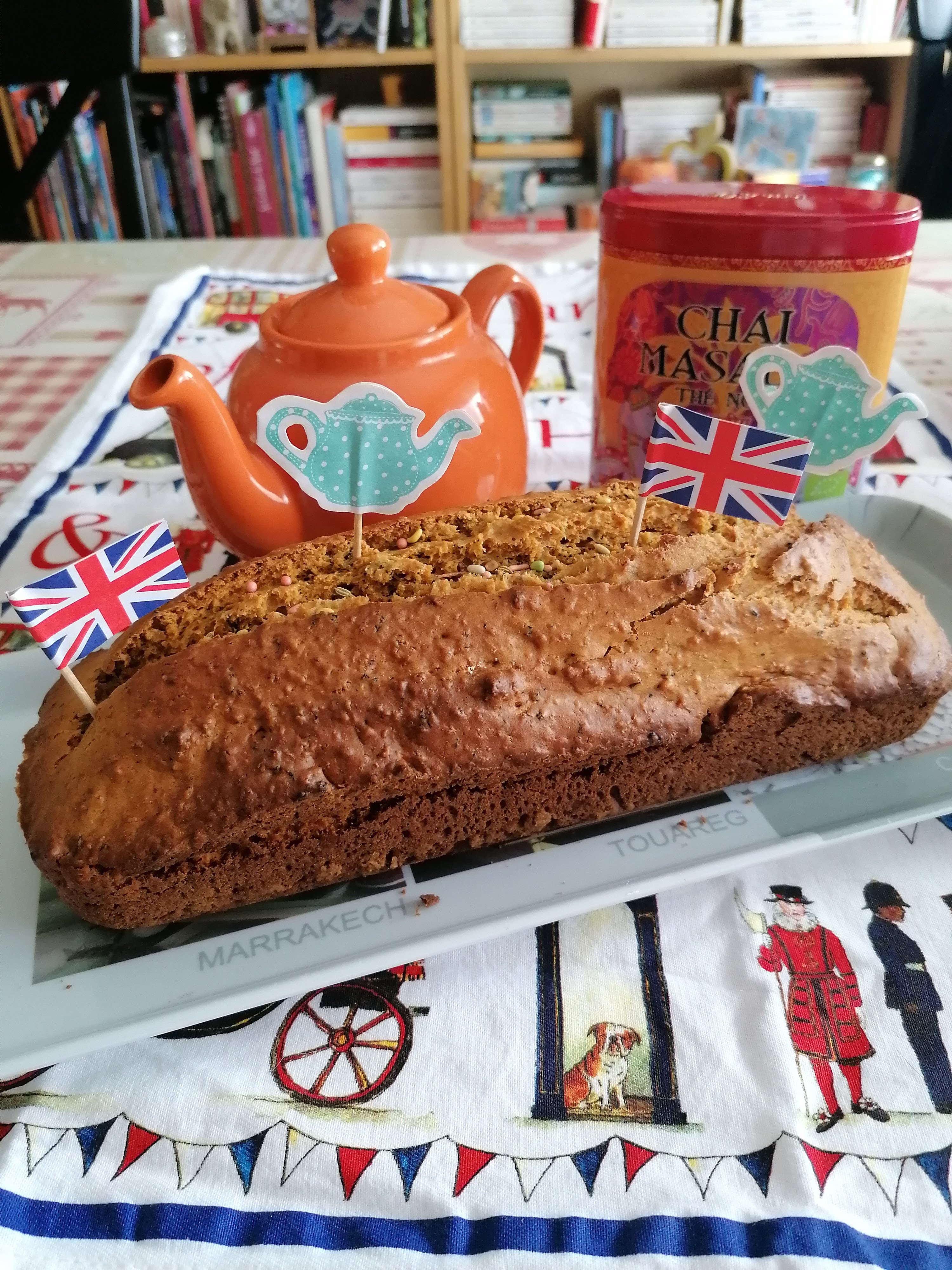 Pas de glaçage pour ma part, juste une petite déco avec mes drapeaux, et un peu de pan masala. J’ai sortir ma tea towel habituelle très anglaise et utilisé l’excellent thé chai Masala offert par Blandine.