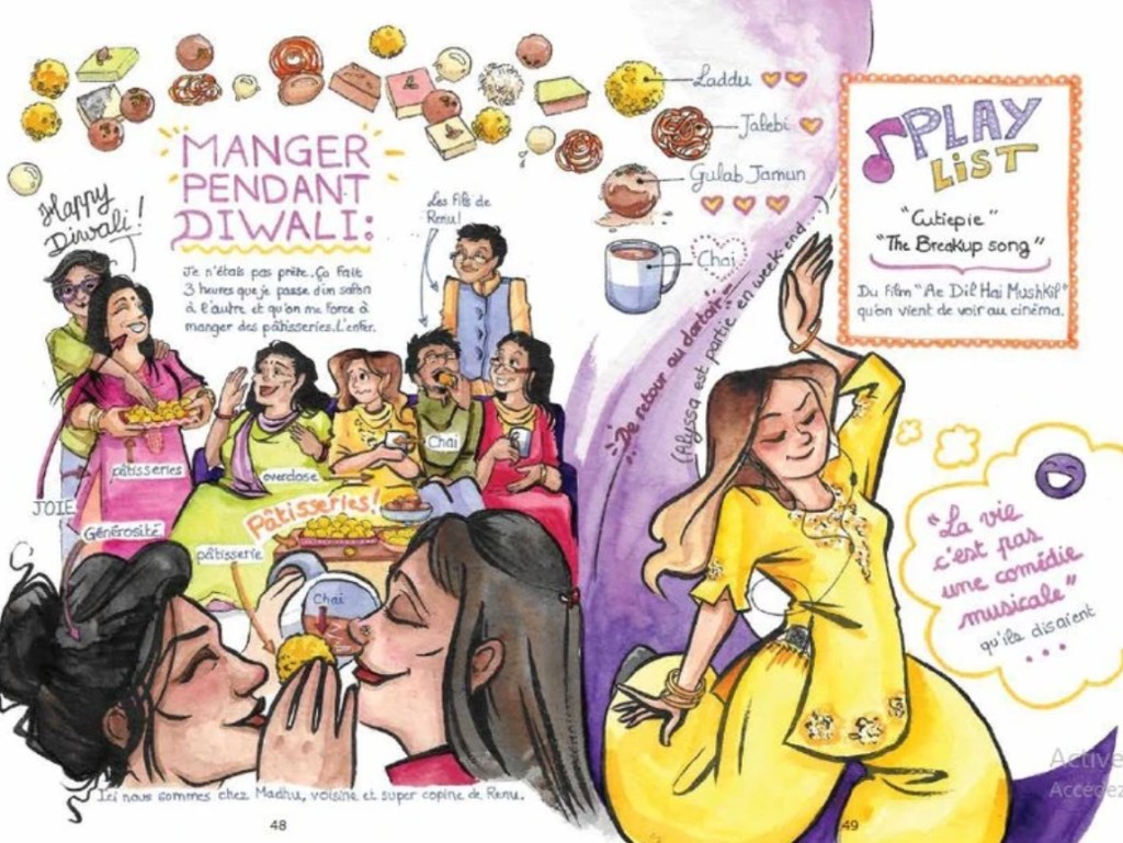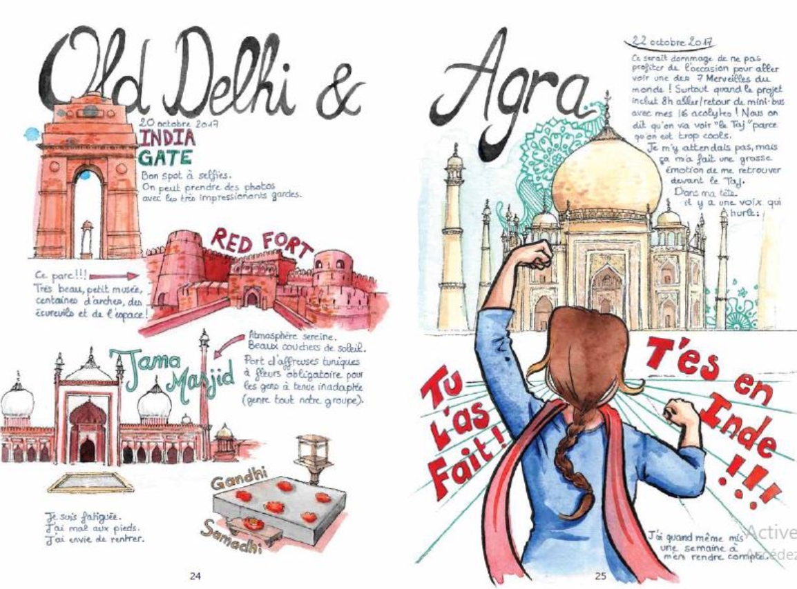 Clara partage des moments de sa vie quotidienne en Inde, avec des hauts et parfois des bas, des croquis, des choses qu’elle découvre. Elle nous parle de cinéma, de cuisine, de ses tenues (les jolis kurta), des fêtes comme Diwali ou des retrouvailles avec la famille. Elle revient aussi sur les voyages en train, en bus, sur les belles rencontres qu’elle fait au cours de son périple et accorde parfois une pages aux différentes visites avec parfois quelques anecdotes.