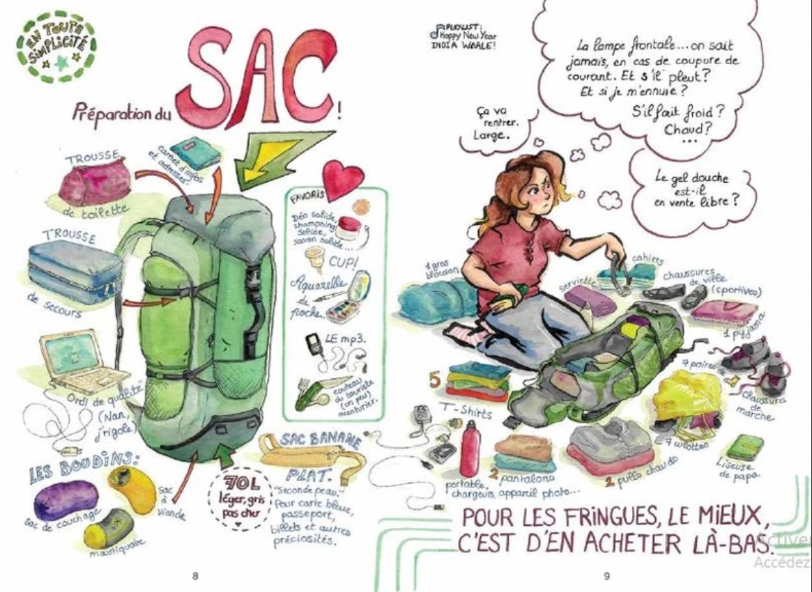 Il s’agit d’un récit autobiographique illustré à l’aquarelle, très coloré avec des polices de caractère punchy, beaucoup d’humour et de nombreux petits objets illustrés. Certaines planches sont particulièrement belles. C’est aussi très dynamique, les sujets s’enchaînent suivant une chronologie un peu secondaire, à mon sens.