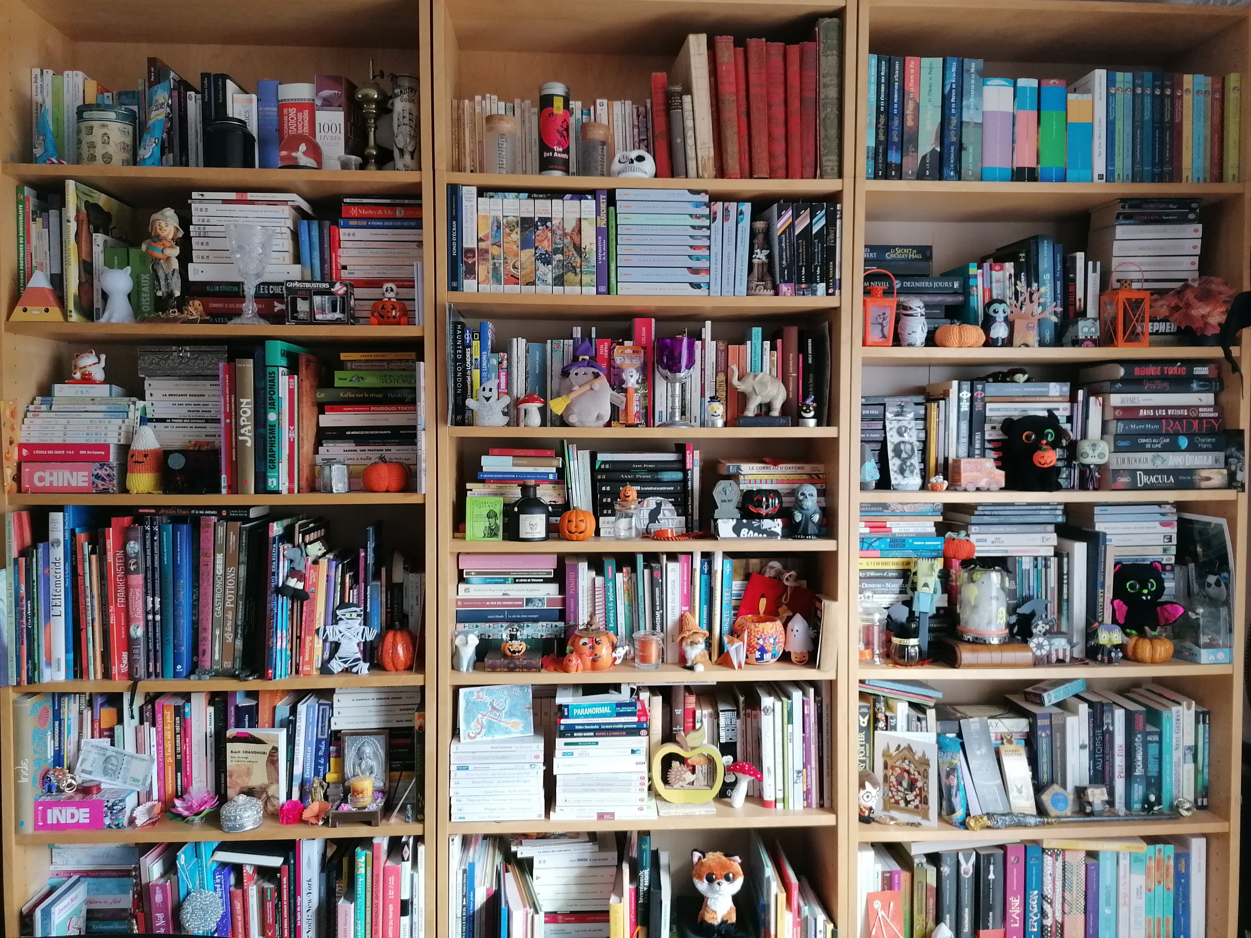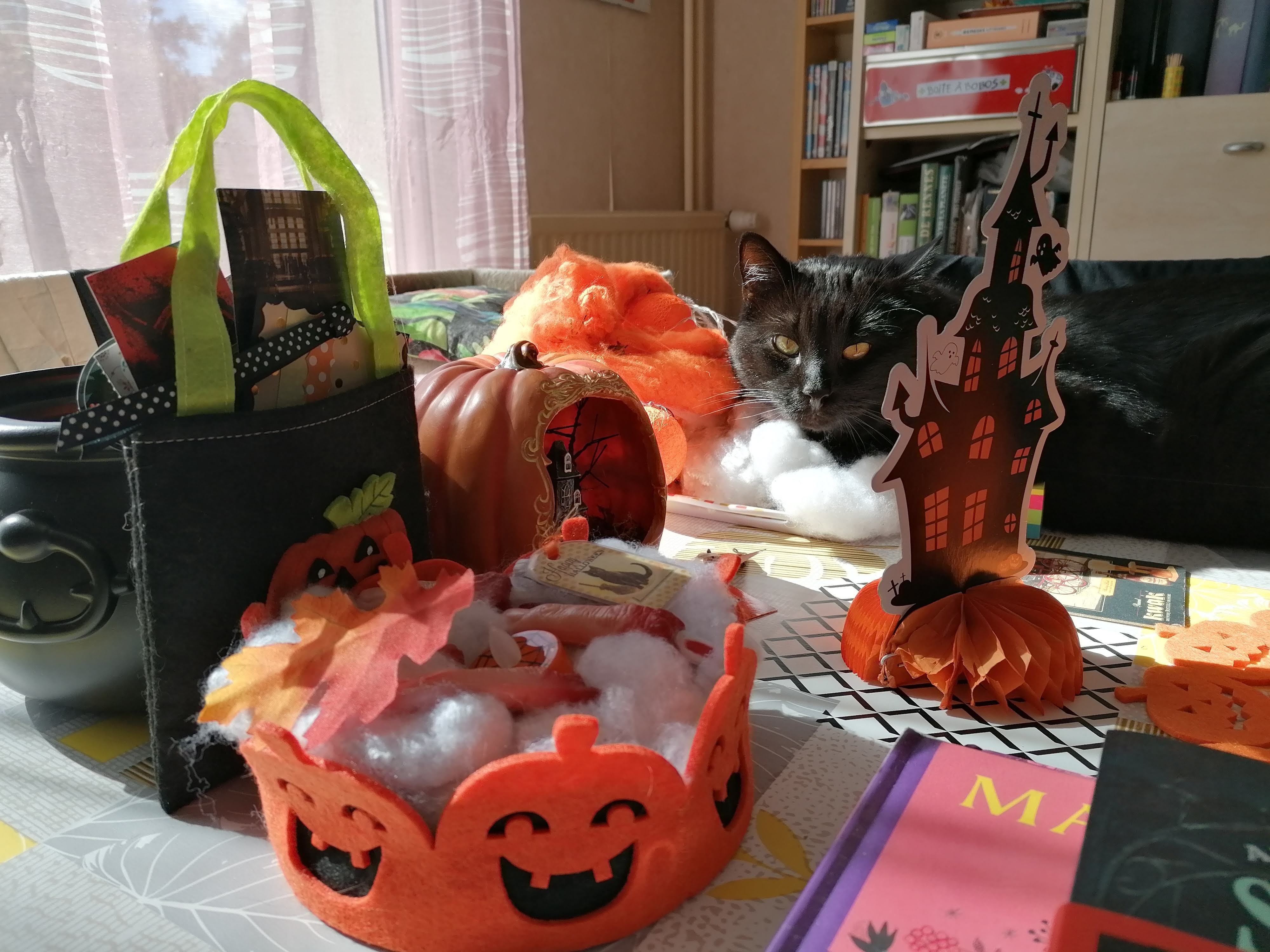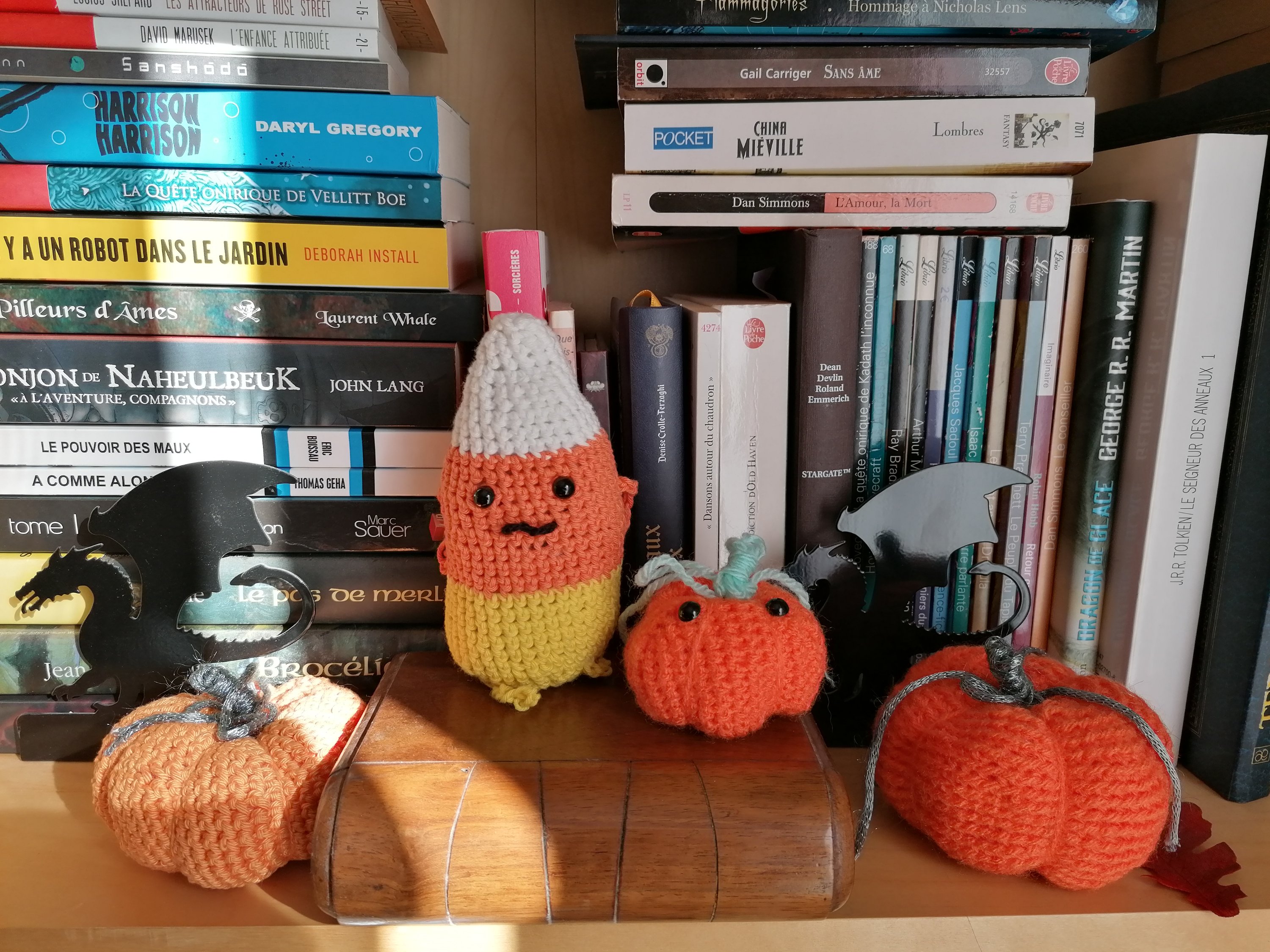 Dimanche, j’ai commencé à décorer la maison, à déballer les décorations d’Halloween et à installer toutes mes petites créatures dans la bibliothèque ! C’est une joie de retrouver vampires, momies, sorcières, candy corns et autres squelettes, zombies et citrouillettes. 🙂 A la semaine prochaine et profitez bien des petits plaisirs de l’automne.