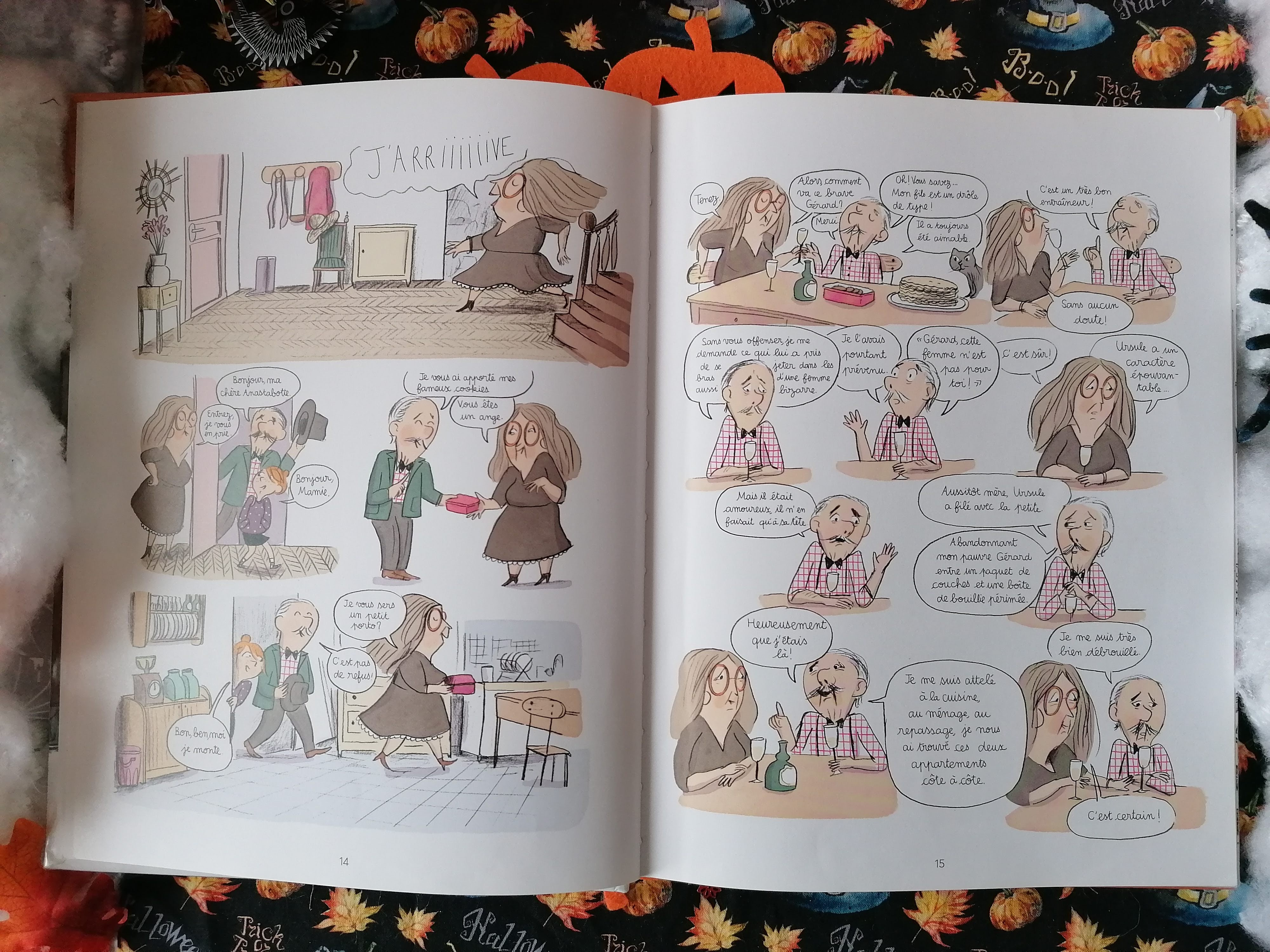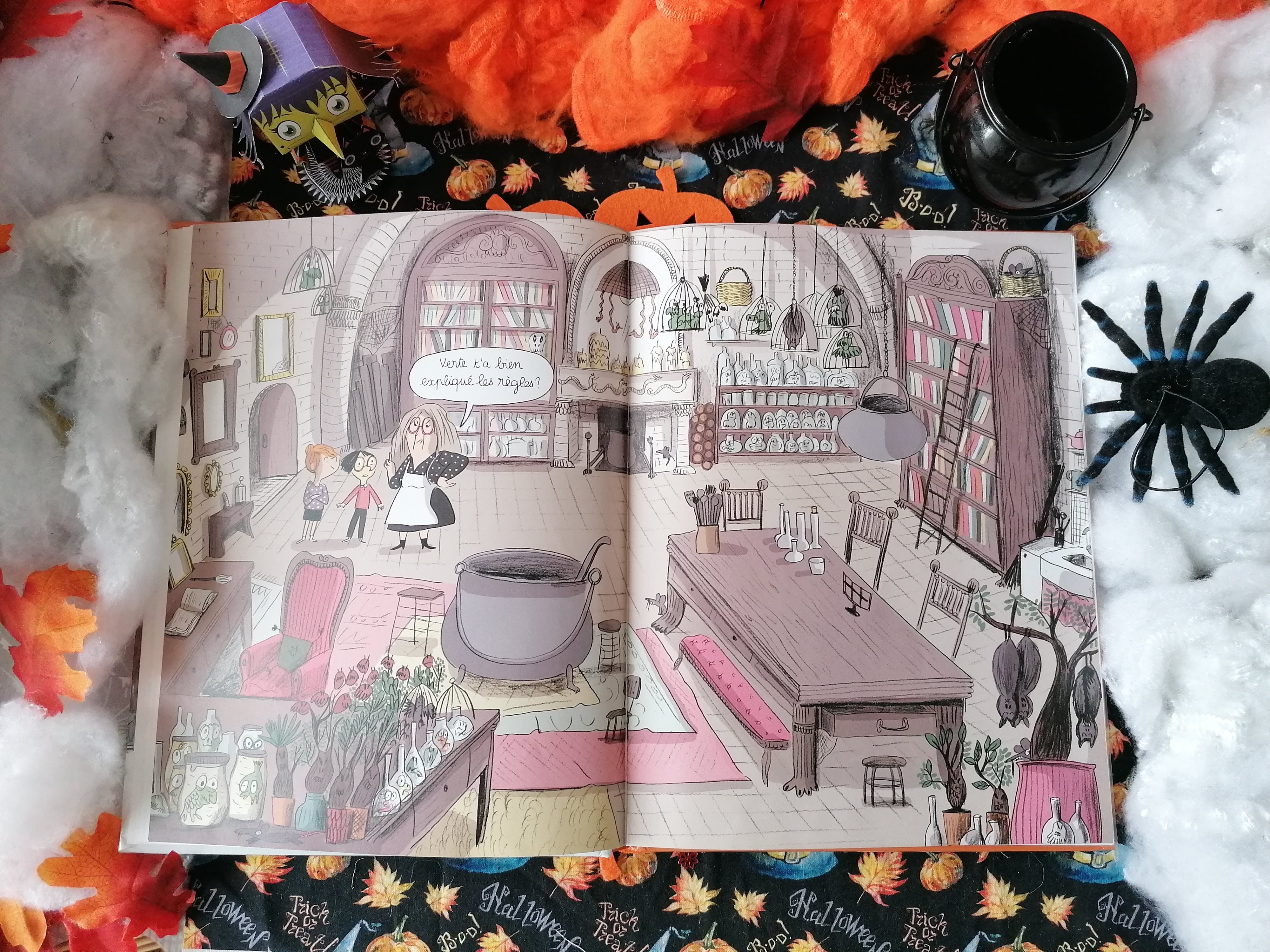 J’aime bien les dessins et surtout l’illustration centrale en double-page représentant l’atelier de sorcellerie de la grand-mère. On l’avait déjà découverte dans le tome précédent. C’est une pièce tout à fait charmante, avec de belles proportions, de splendides bibliothèques, un fauteuil confortable où s’installer pour consulter des grimoires, une impressionnante collection de bocaux et une belle marmite pour faire mijoter toutes sortes de préparations.