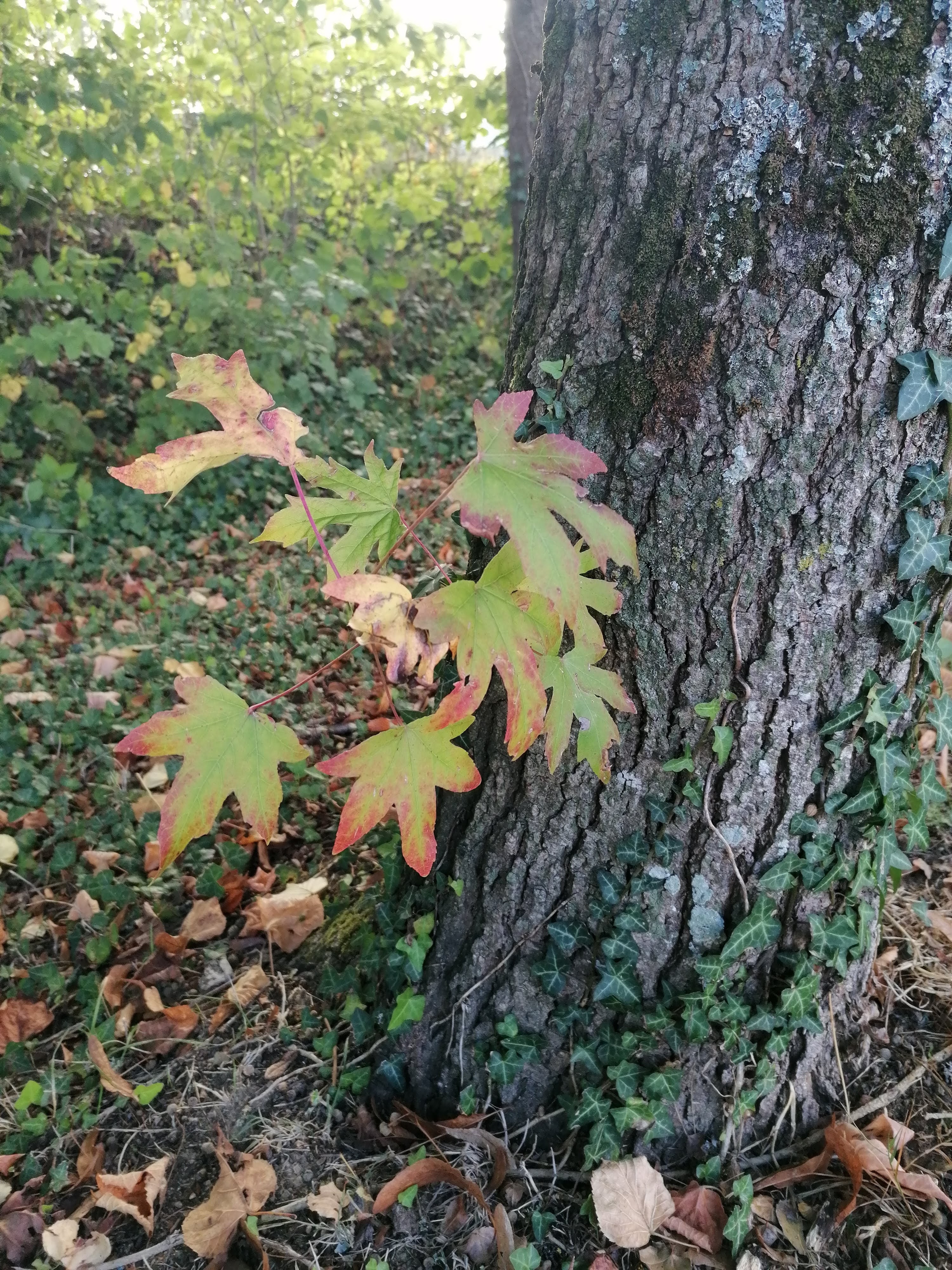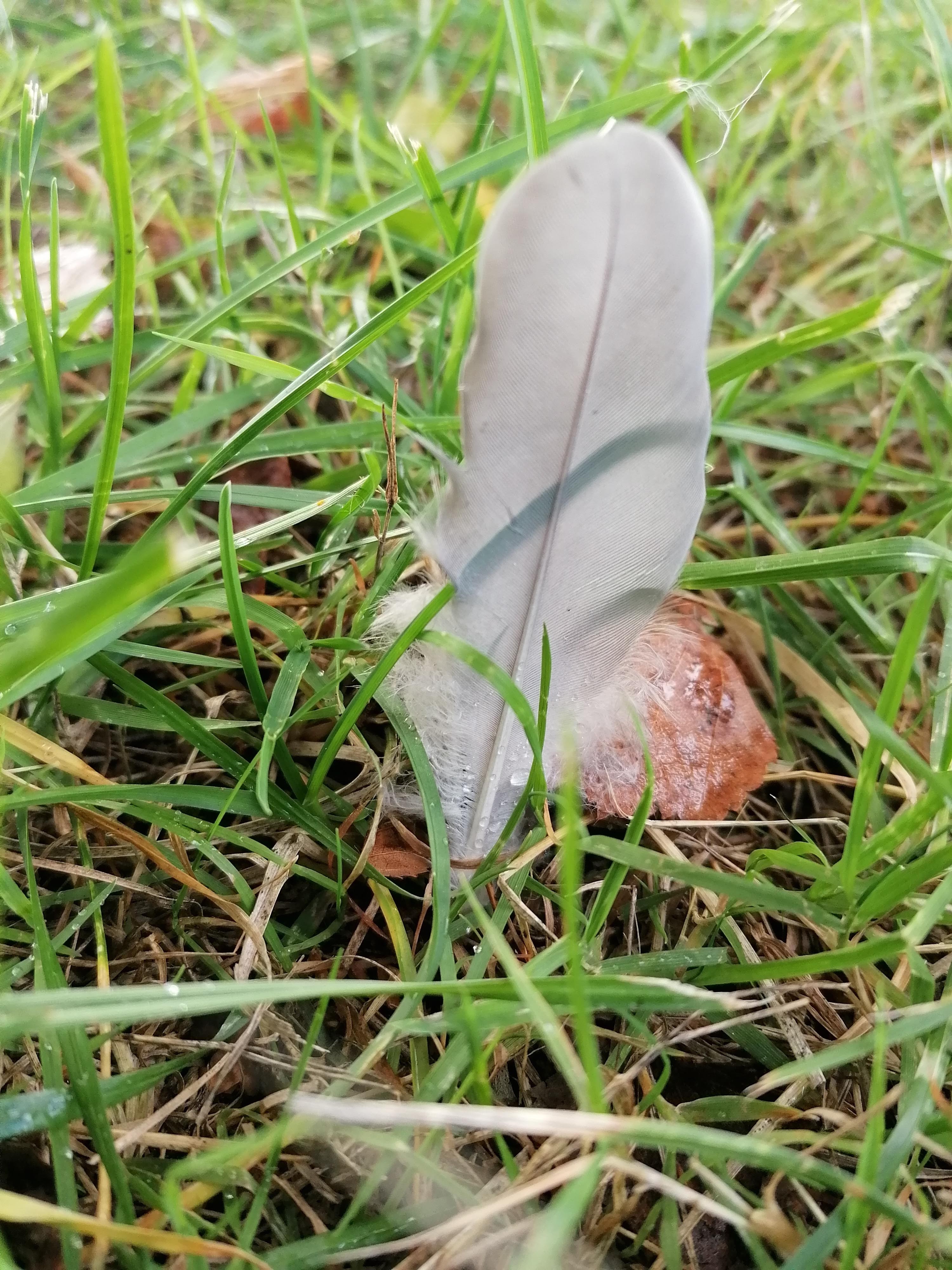 Des feuilles au sol, qui commencent à changer de couleur, une plume plantée là ! L’an dernier, au mois d’octobre, j’avais ramassé des feuilles, des glands, des plumes, des noisettes et fait une petite composition automnale, je vais peut-être recommencer !