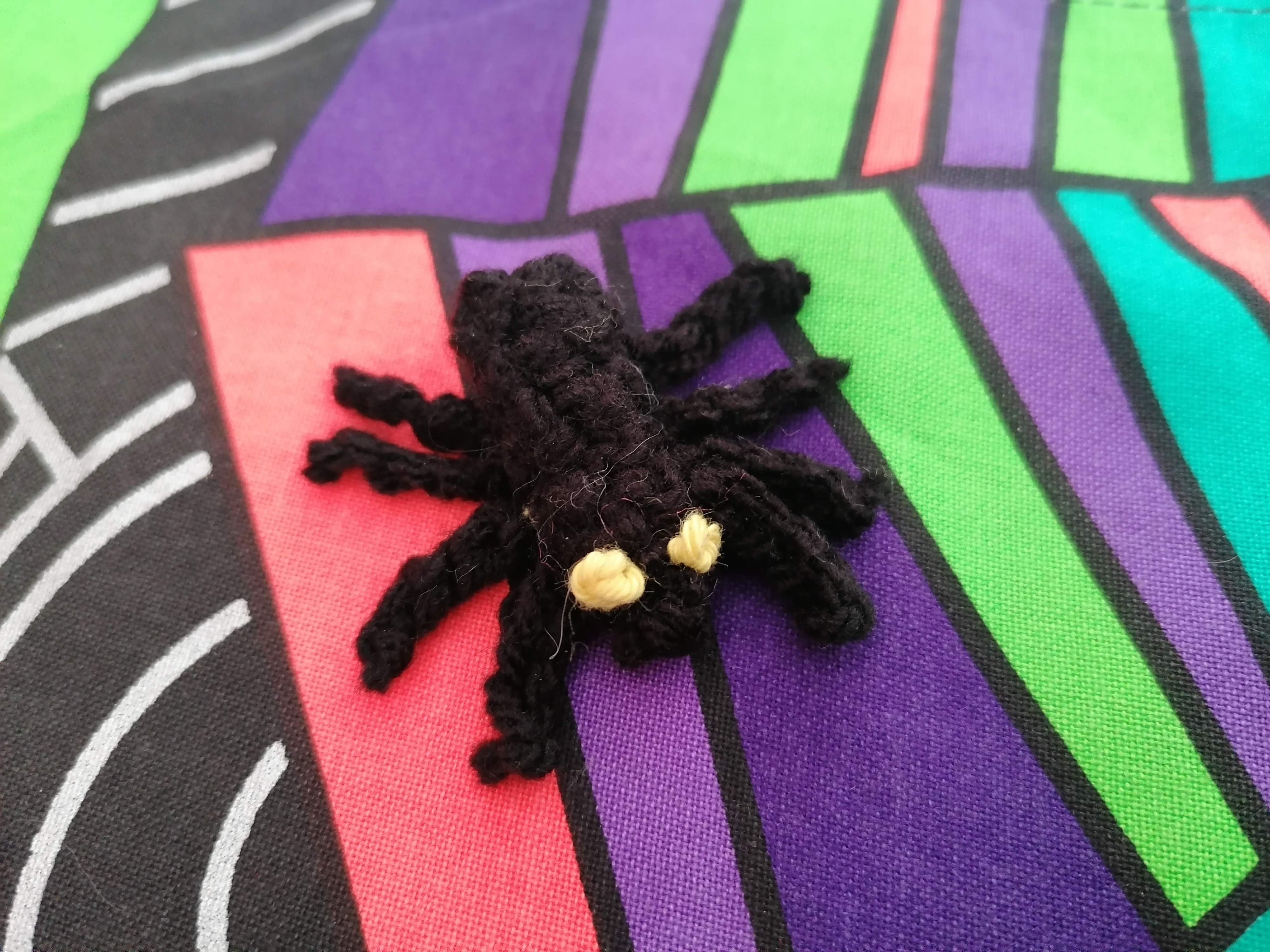 Pour les pattes, j’ai fait 8 chaînettes de 4 mailles ! Après, il faut rentrer tous les fils et ajouter les yeux que je trouve un peu gros compte tenu de la taille de la bestiole !