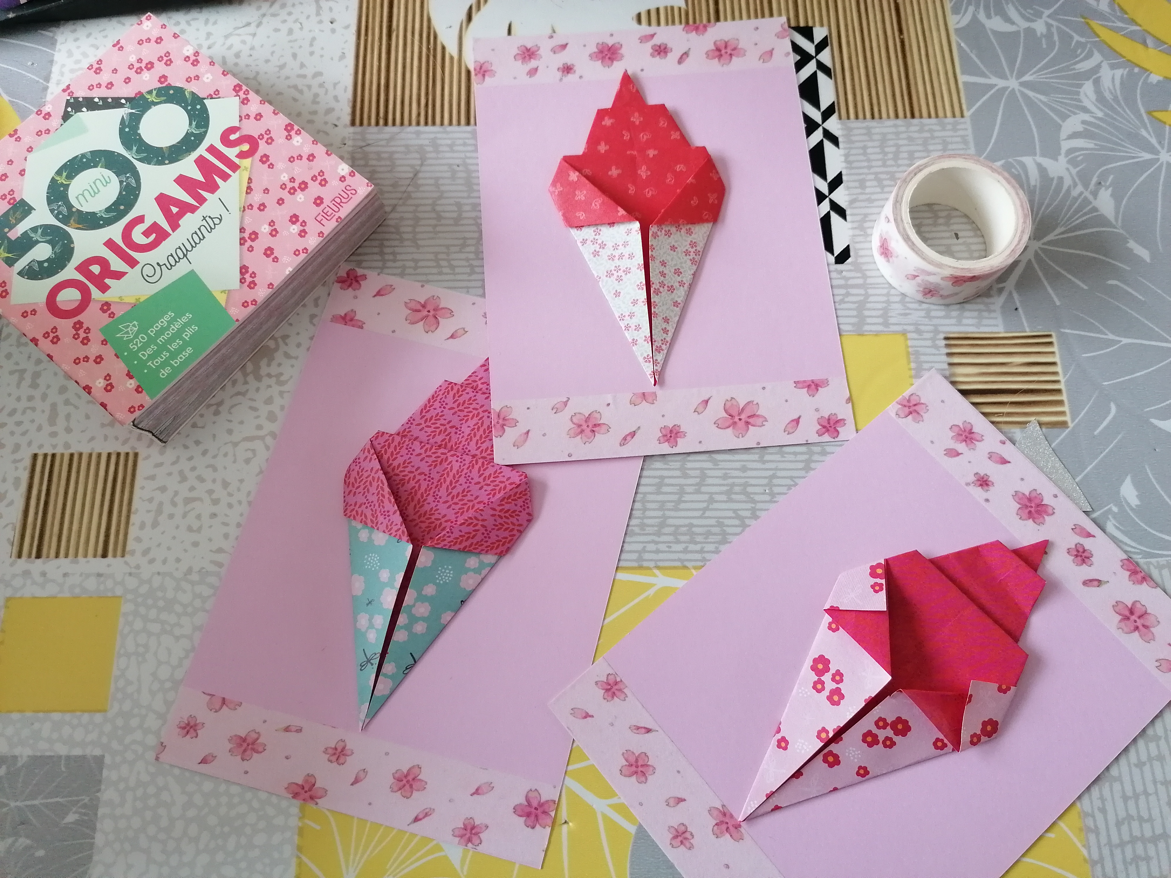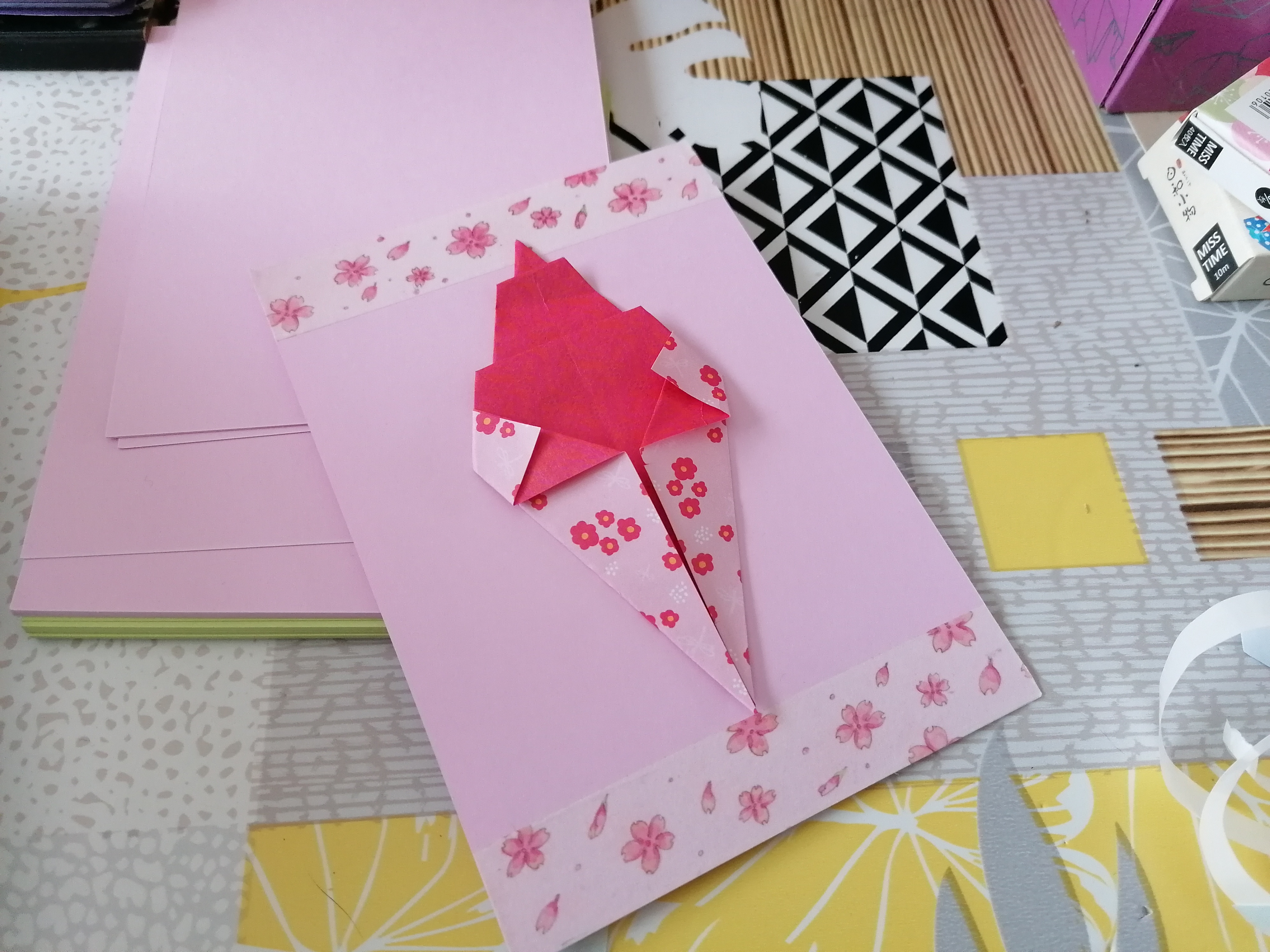 Aujourd’hui, je vous propose de faire des glaces en origami ! J’ai choisi de coller mes glaces à la fleur de cerisier (parfum subtile et délicat) sur des cartes pour mes correspondantes d’ici et d’ailleurs. Le cornet est bien comestible ! 😉