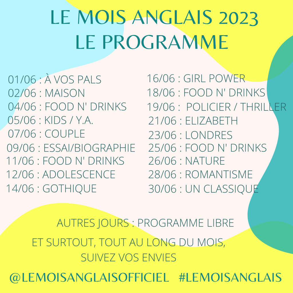 « Le Mois anglais, c’est l’occasion de se retrouver pour partager sur nos lectures, des films, des séries, des récits de voyage, des découvertes d’artistes, ou encore des plats anglais… bref, tout ce qui a un rapport direct avec l’Angleterre. »