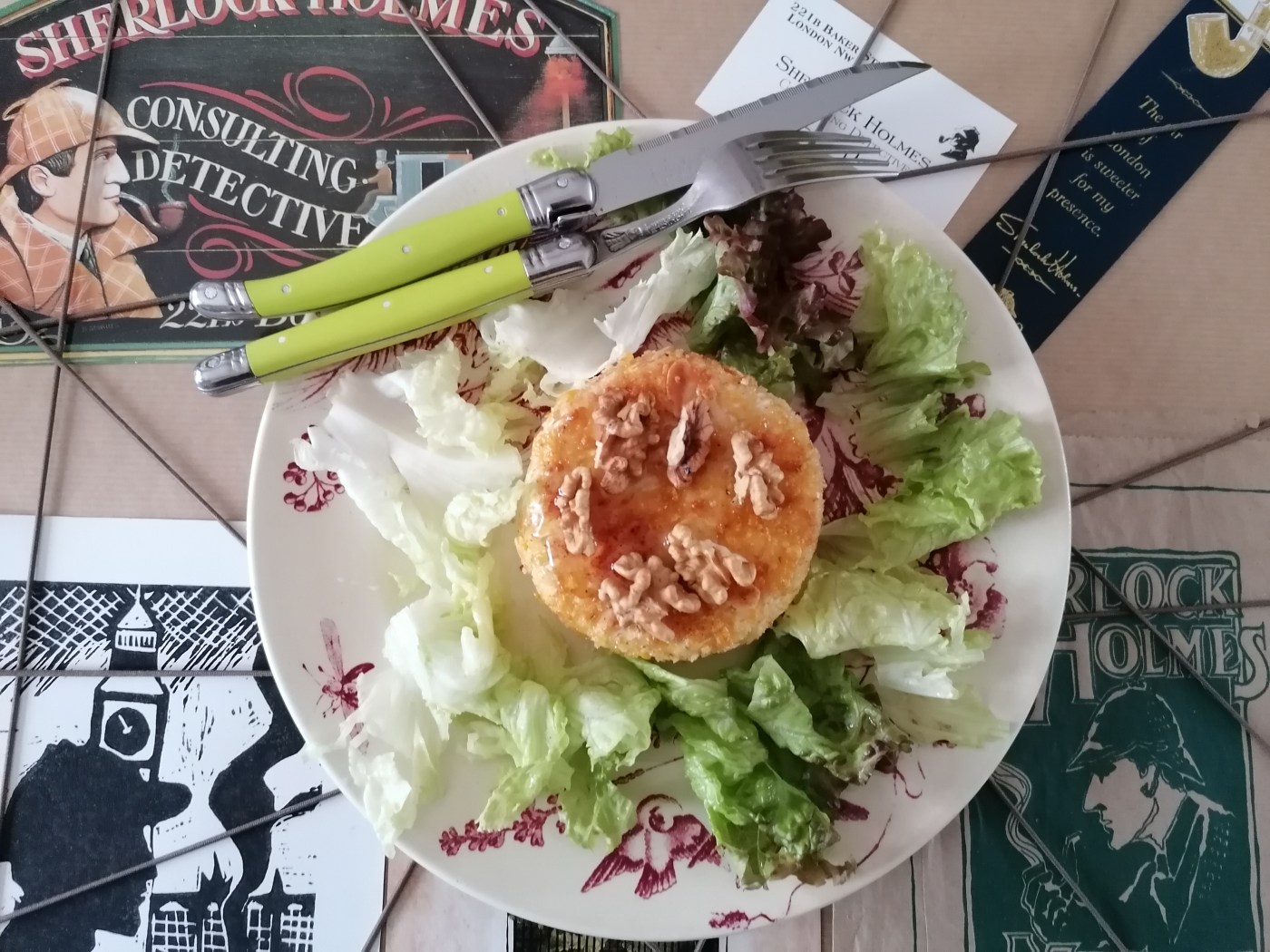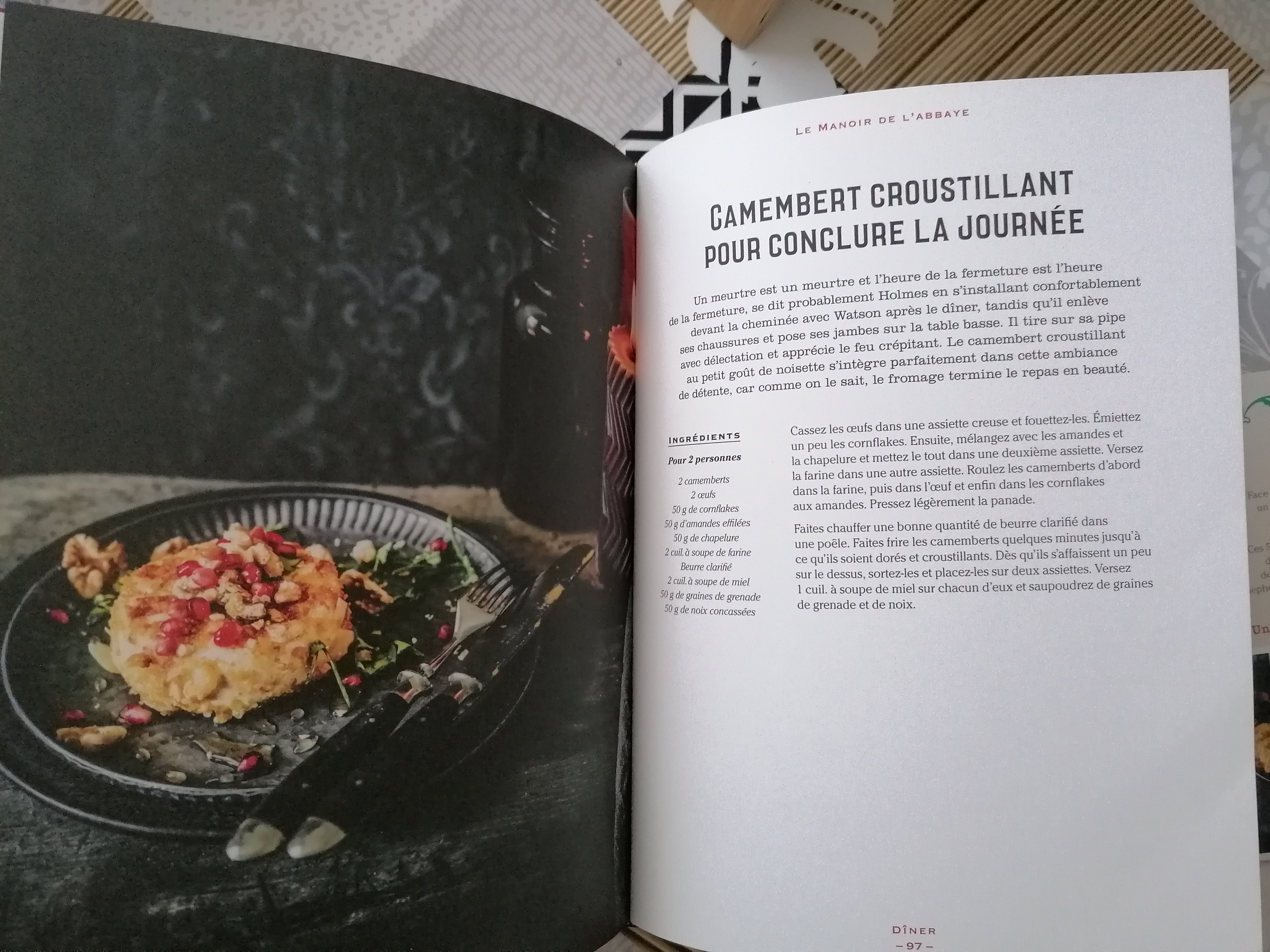 La mise en page est soignée, les photos appétissantes, chaque recette est replacée dans son contexte holmésien mais les plats cités ne proviennent pas toujours de l’œuvre d’Arthur Conan Doyle. C’est parfois une interprétation libre, c’est bien de le savoir et c’est d’ailleurs le cas pour cette recette. Pas de citation, pas d’extrait mentionnant un Sherlock en train de déguster son fromage pané mais l’auteur l’a imaginé !