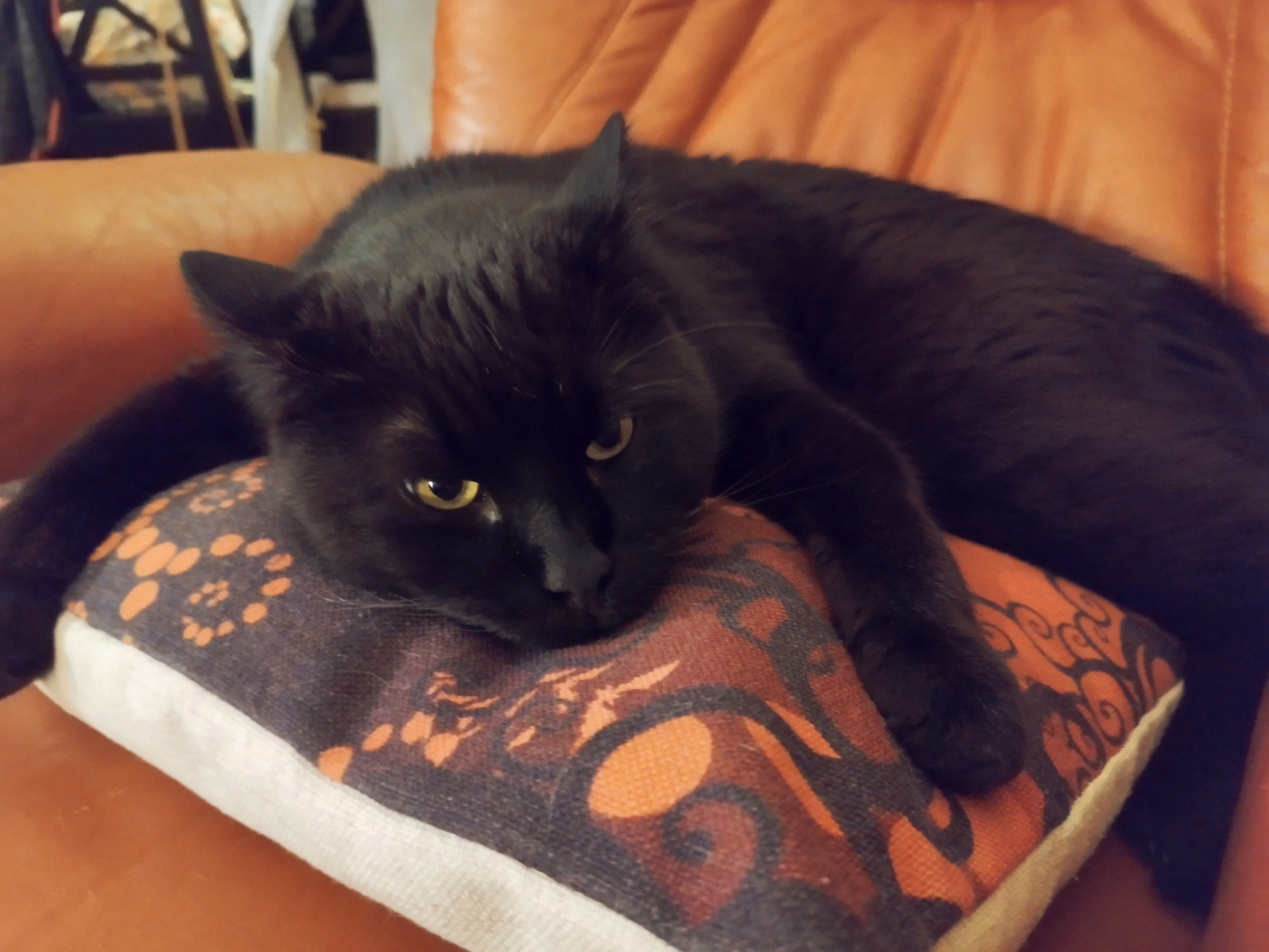 Je ne sais pas si vous avez remarqué mais Mr Chat s’est approprié un des coussins halloweenesques. A peine installé et déjà convoité.