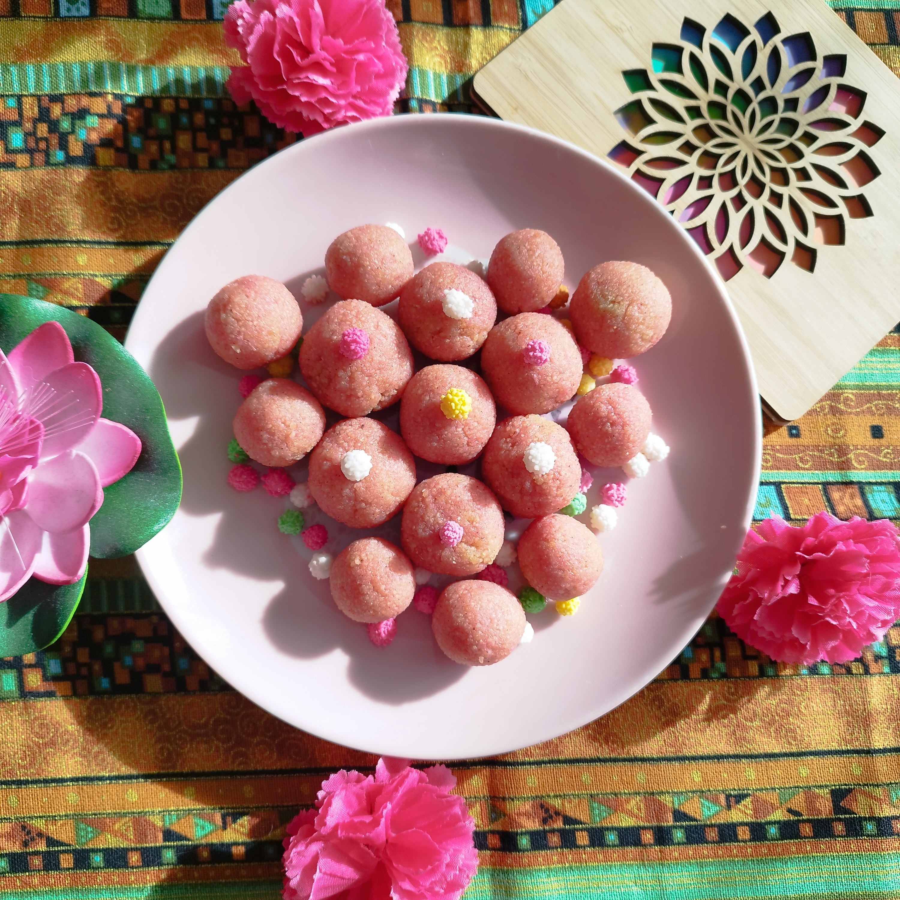 C’est drôlement bon, ça me fait penser à de la pâte d’amande épicée. Mr Hilde a aimé aussi. Je suis contente de mon colorant à la betterave qui donne une petite teinte rosée aux ladoos. J’en referai, c’est sûr !