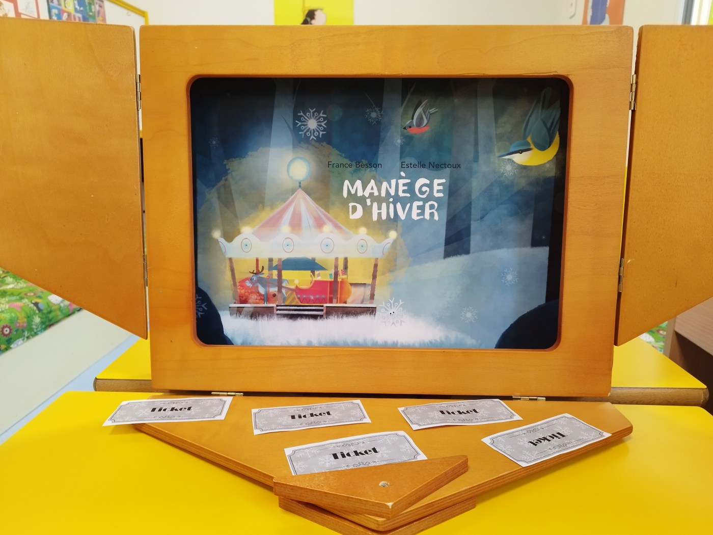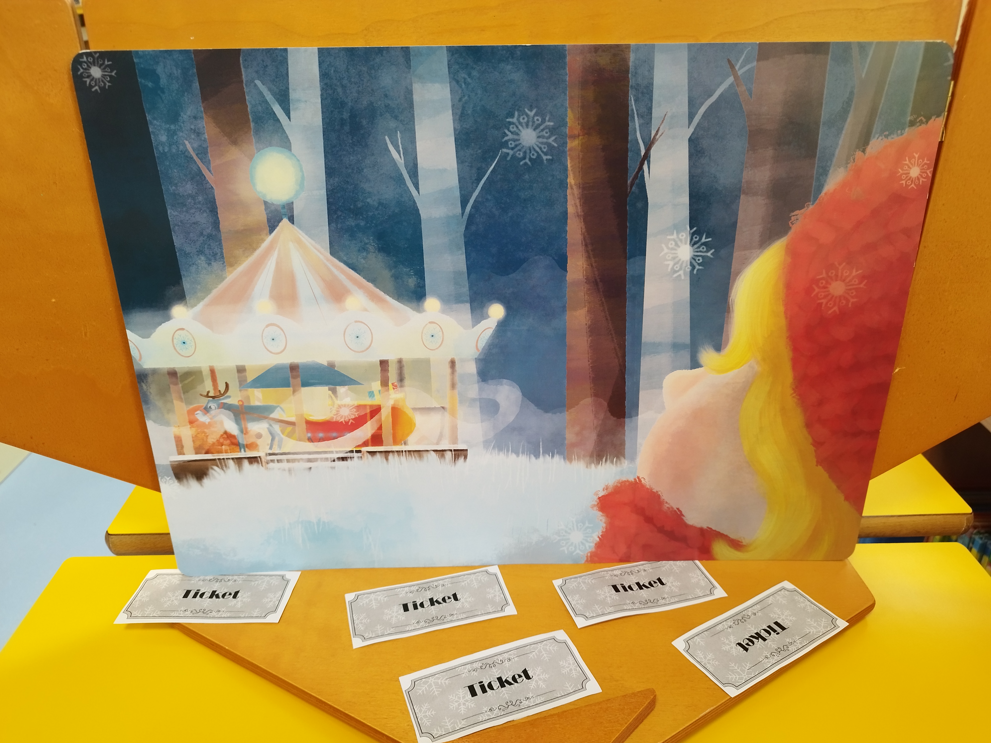 Nous avons imprimé les tickets de manège et avons animé à deux. Je me suis occupée de la lecture et ma collègue distribuait les tickets et invitait les enfants à participer.