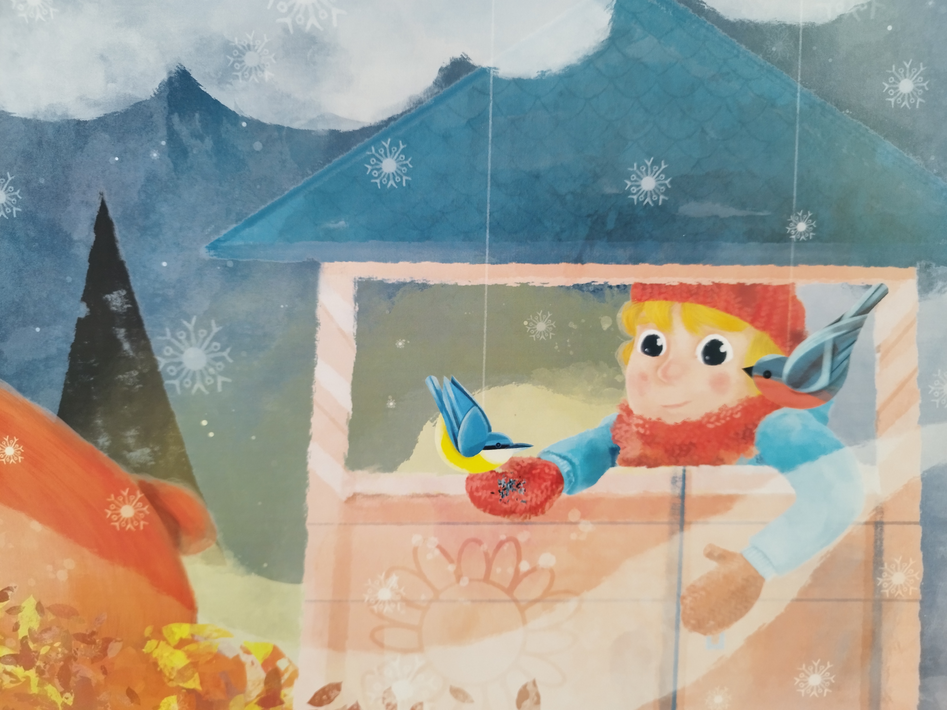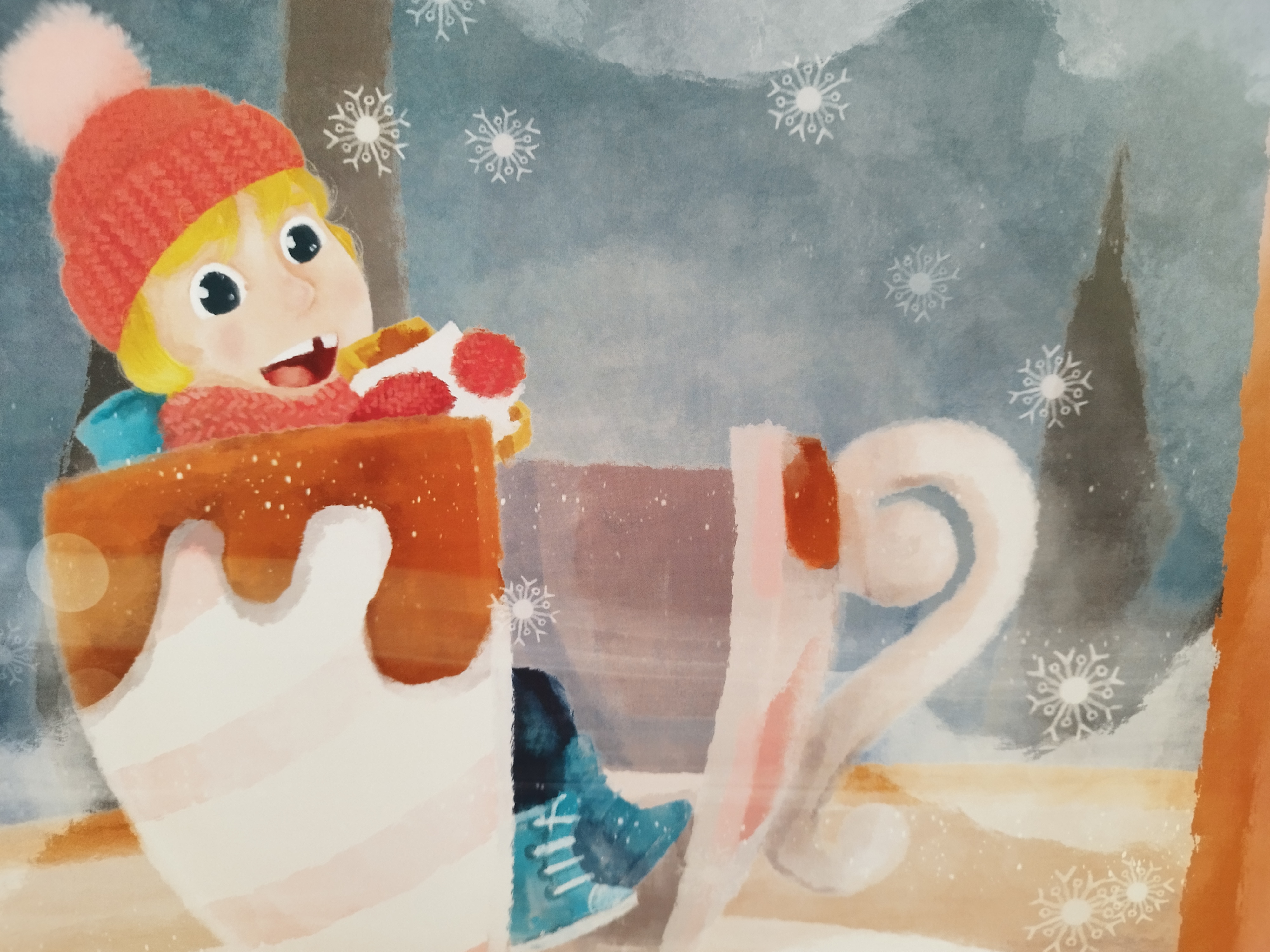 Les illustrations sont très belles. Beaucoup de douceur, de la neige, un ours endormi, un peu de gourmandise. C’est la magie de l’hiver et une invitation à la rêverie. C’est assez poétique et onirique.