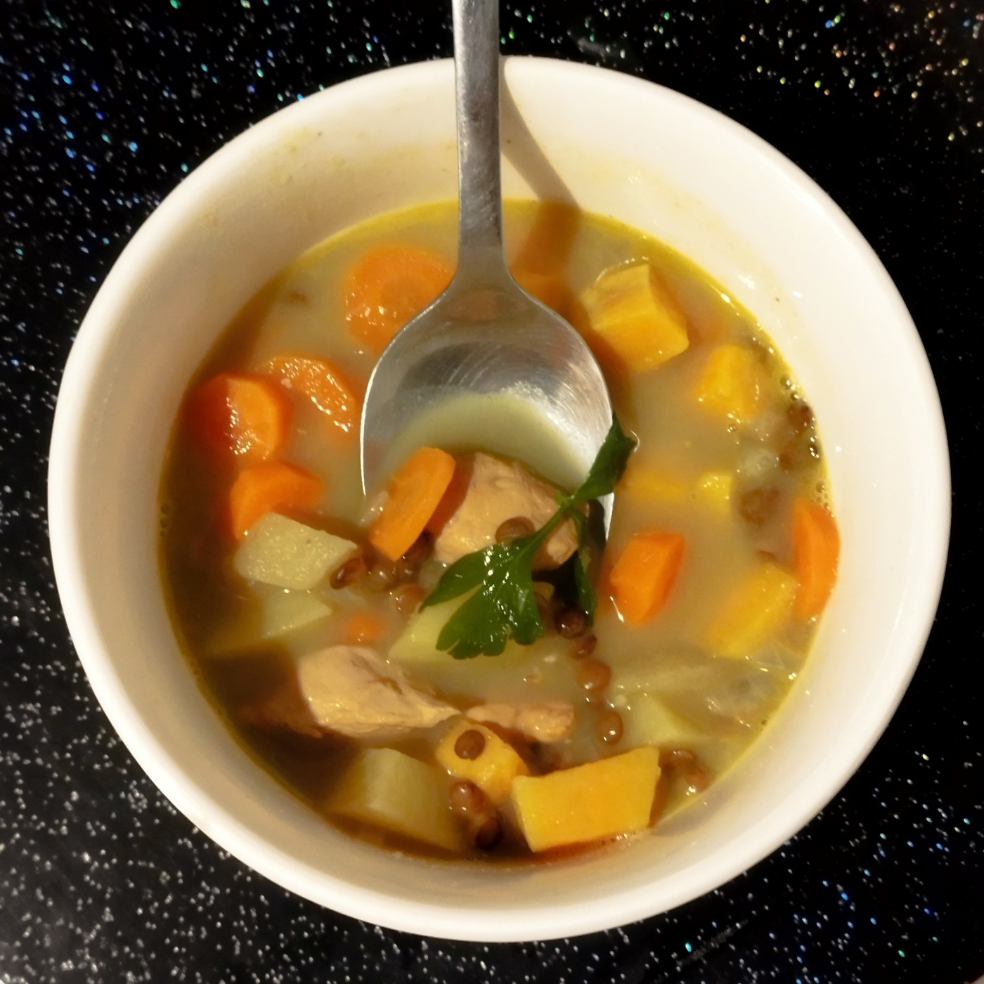 Les ingrédients utilisés : des escalopes de poulet, de la patate douce, une pomme de terre, des carottes, une pomme, des lentilles vertes sèches, de l’oignon, de l’ail, du gingembre frais (j’utilise toujours ma pâte d’ail et de gingembre), du lait de coco, du cumin, de la pâte de curry douce ou épicée selon les goûts, de la coriandre fraîche, de l’eau, un peu de sel et d’huile d’olive