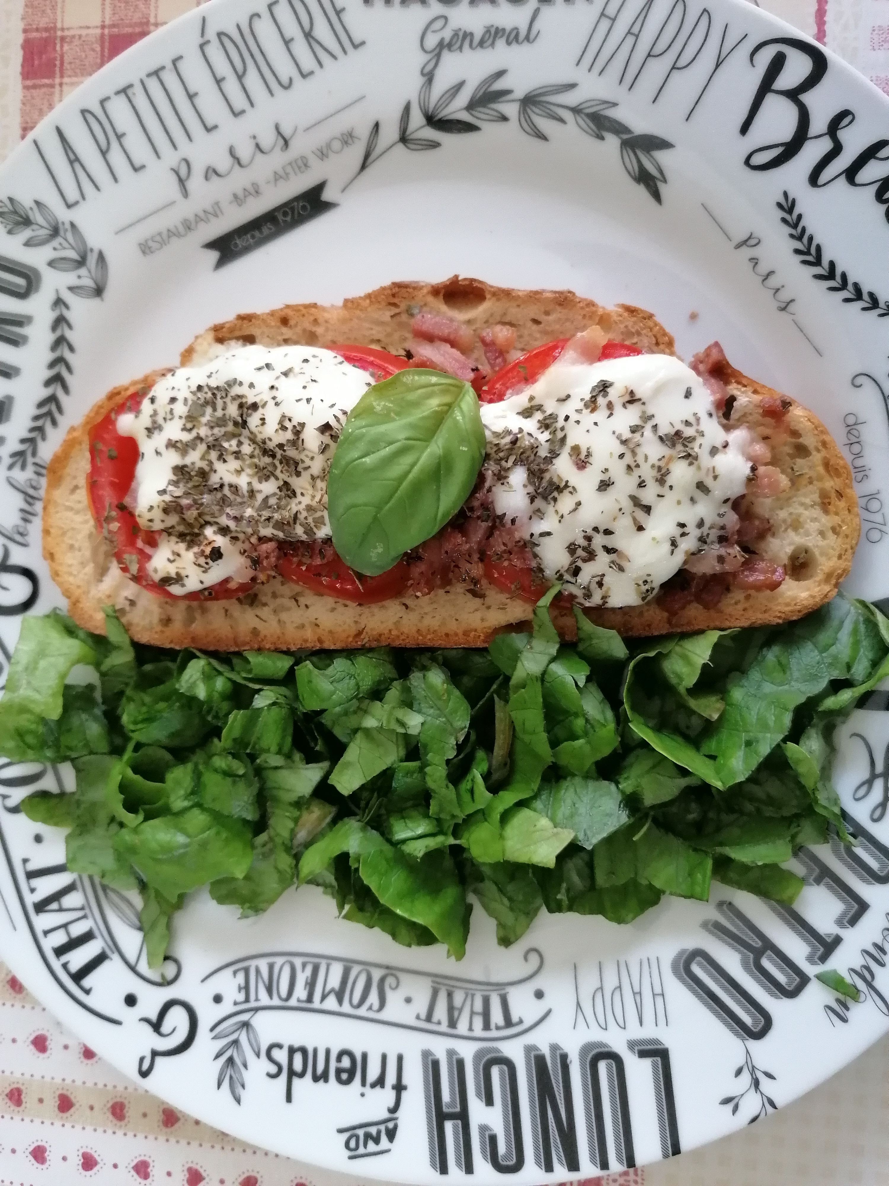Une fois les tartines sorties du four, frottez de l’ail sur chacune et ajoutez la garniture : rondelles de tomate, lardons, mozzarella et un peu de basilic en poudre (si vous n’avez pas de basilic frais) pour dix minutes. Ajoutez le basilic frais ciselĂ© aprĂšs la cuisson et servez avec une petite salade.