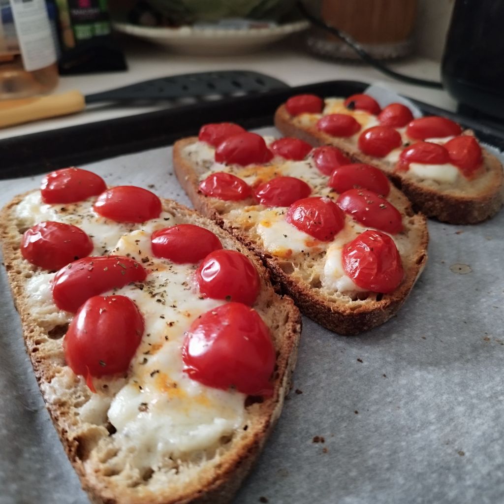 La recette est presque identique à celle de 2021. On a ajouté de la burrata sur une partie des tartines et de la mozzarella sur les autres. Ensuite, on les a cuites avec une partie de la garniture.