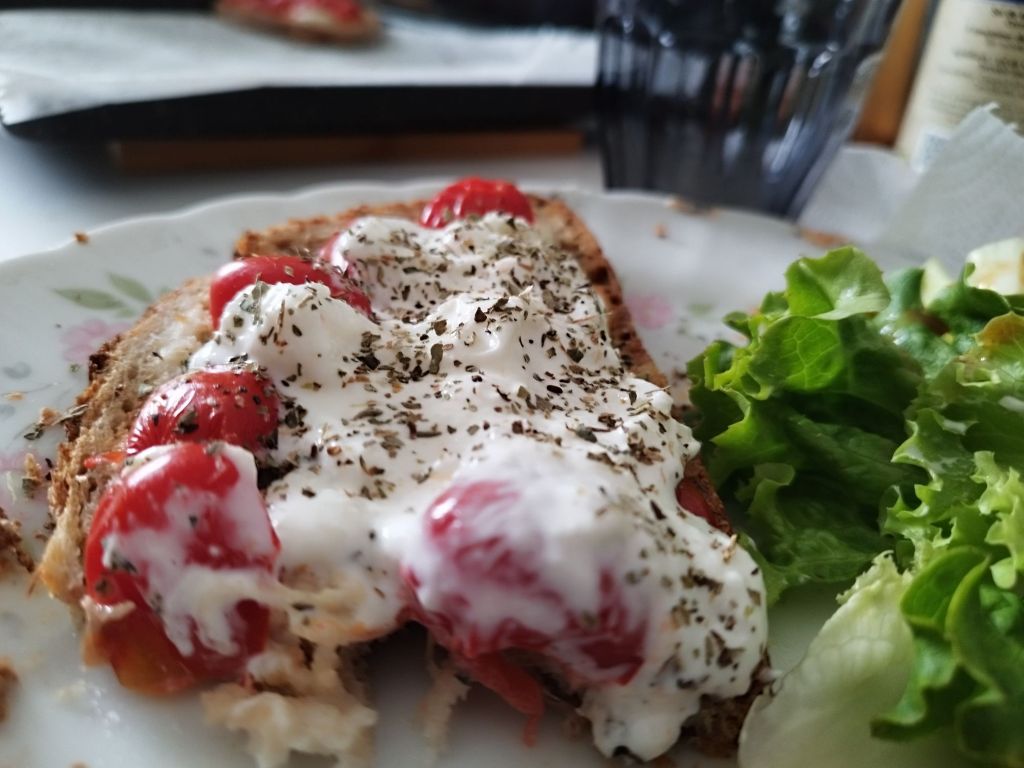 En 1995, au retour de notre voyage en Italie, Maman essayait de refaire les dĂ©licieuses tartines mangĂ©es prĂ©s de Naples. On a adoptĂ© la recette et on en fait assez souvent, c’est rapide et facile Ă  faire.