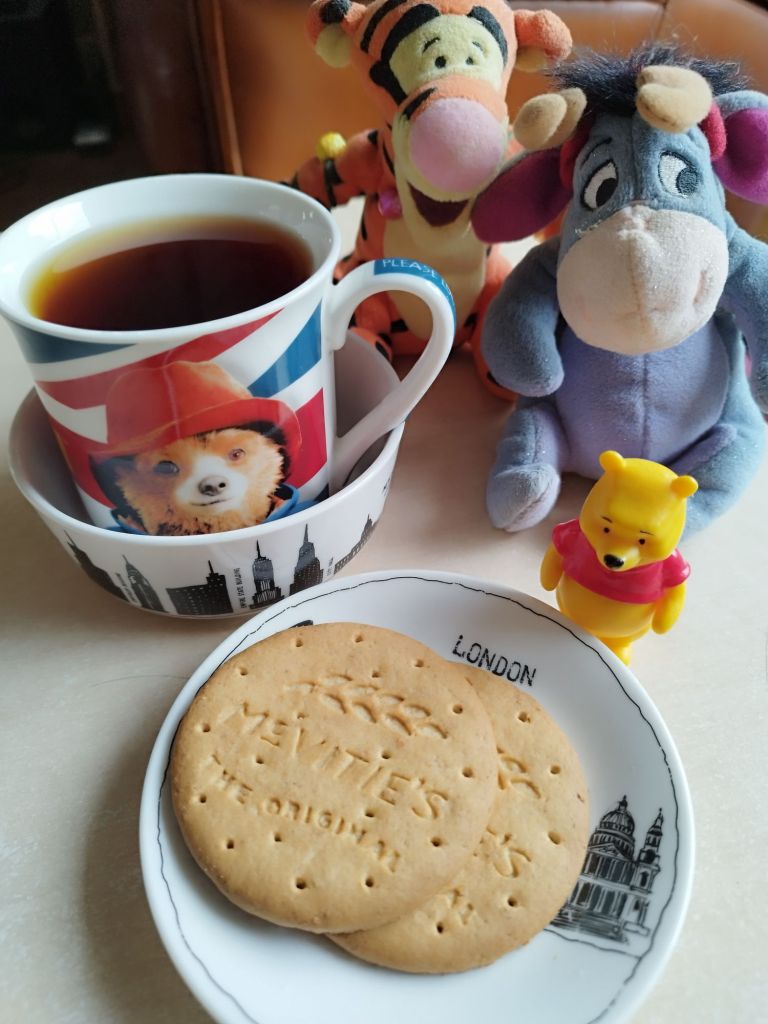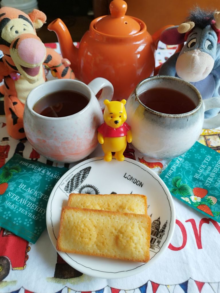 Et puis aujourd’hui, je me suis beaucoup amusée avec Winnie L’Ourson ! J’ai pris le thé avec Winnie, Bourriquet, Tigrou  et Mr Hilde. On a pris des photos en finissant notre délicieux thé noir aux fraises acheté chez Fortnum lors du dernier voyage à Londres ! Certaines doivent se dire, ça y est Hilde est en train de craquer… Mais, c’est déjà fait ! 😅Je me sens un peu mieux mais par moment ce n’est pas facile.