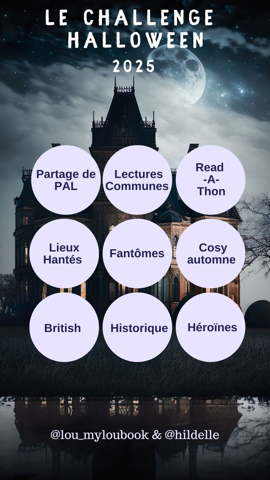 Pour retrouver les billets : Nous vous proposons d’identifier vos billets du challenge par un mot clé (tag) que vous utiliserez pendant toute la durée du challenge : « Challenge Halloween 2025 » ou « Challenge Halloween » par exemple (mais vous pouvez varier). Il vous suffira ensuite de nous transmettre le lien du tag, et nous listerons tous les participants en renvoyant directement sur ce lien… ce qui permettra à tout le monde d’accéder facilement aux billets de chacun.