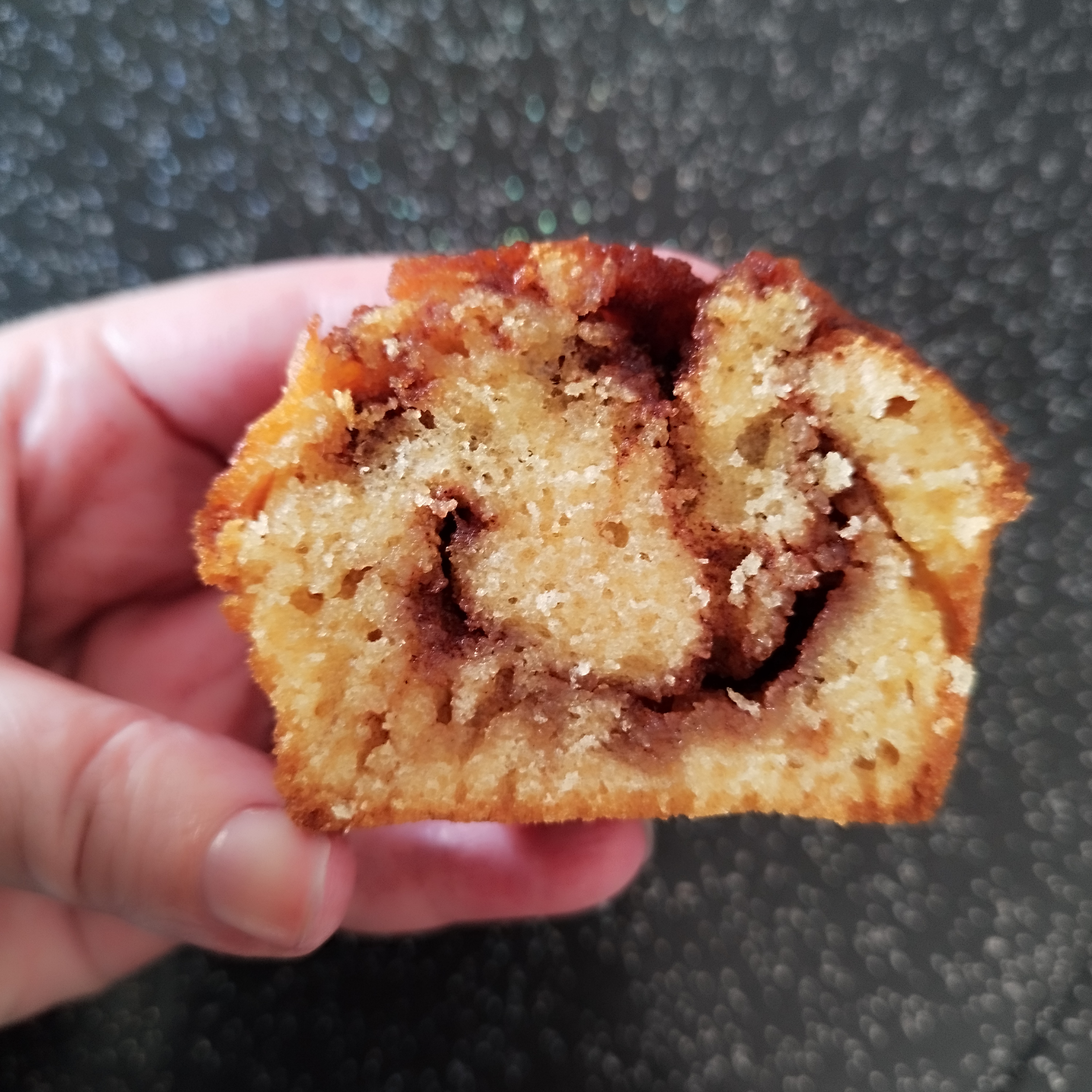 Après quelques péripéties en cuisine, il est temps de goûter ces jolis muffins. On les trouve vraiment très bons. C’est un joli clin d’œil aux cinnamon rolls. La pâte à la cannelle à l’intérieur est terrible ! Elle est ressortie un peu par le dessus, c’est une tuerie ! Ils sont bien moelleux comme annoncés et faciles à faire.
